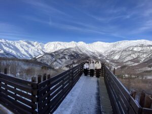 写真は岩岳マウンテンハーバーの展望台の写真です。名峰が連ねる360度広がる雪山の景色に圧倒され、大変感動しました。